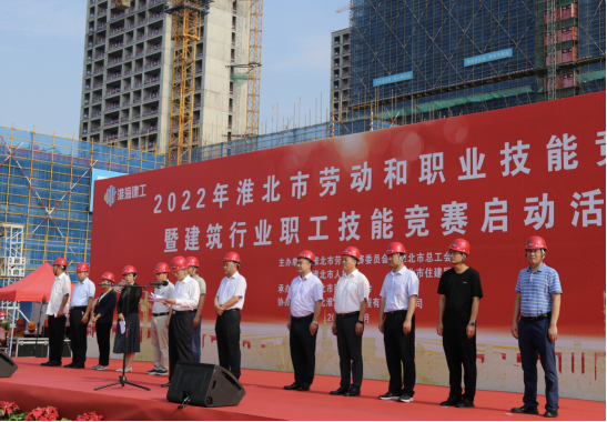 為進一步推進我市技工建設,加快高技能人才培養選拔,促進高質量就業,2022年7月14日上午,由淮北市勞動競賽委員會、淮北市總工會、淮北市人社局、淮北市住建局主辦,淮北市建筑業協會承辦,淮海建工公司協辦的2022年淮北市勞動和職業技能競賽暨建筑行業職工技能競賽在淮北桃花源工程項目部舉行。省、市有關部門領導,市建筑業協會和淮海建工公司領導出席競賽啟動儀式。