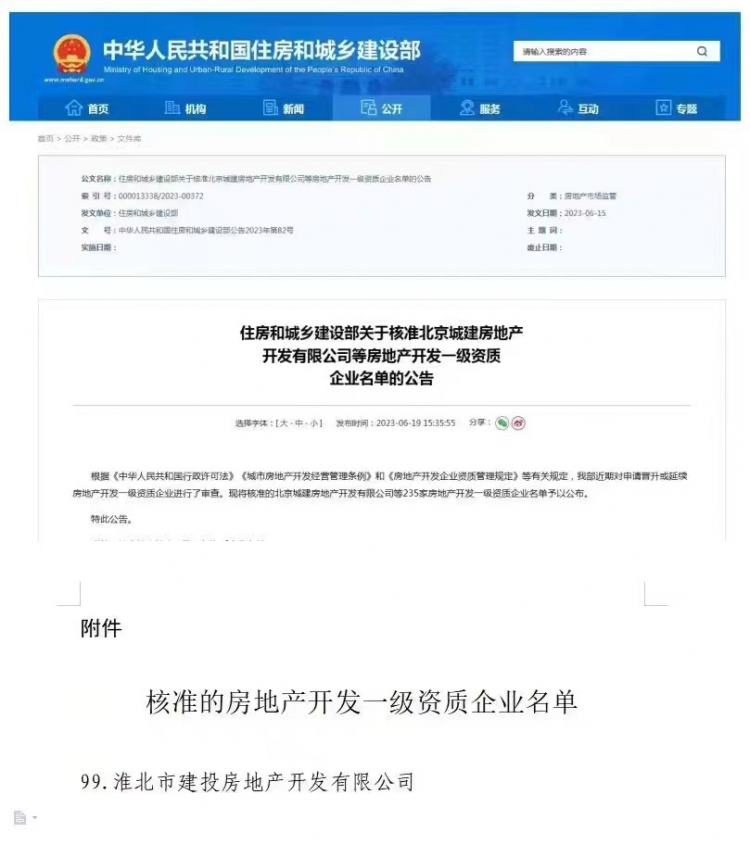 經國家住建部核準,淮北建投控股集團下屬全資子公司淮北市建投房地產開發有限公司獲批國家房地產開發一級資質。