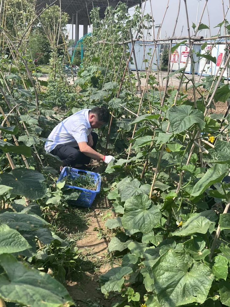 活動現場,天氣雖然炎熱但擋不住黨員勞動的熱情,領取了勞動工具后,分工協作,按照分配好的耕作區域開始認真勞作,清理站內綠化草坪并按照要求進行分類投放,清理的雜草作為站內飼養牲畜的飼料,做到物盡其用,采摘下來的蔬菜水果作為食堂食材,不僅豐富了職工的“菜盤子”,還降低了收費站食堂運營成本。