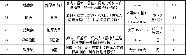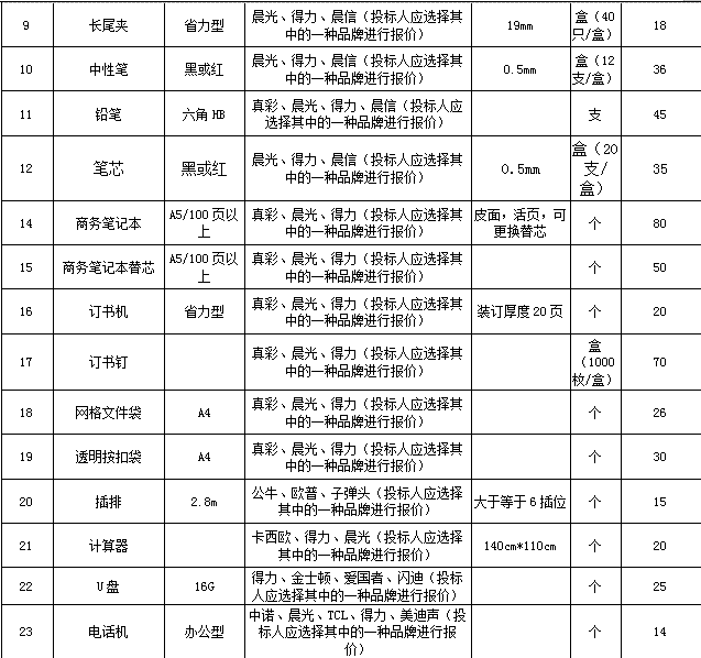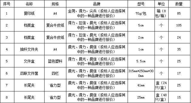招標(biāo)范圍 | 包括但不限于辦公用品的生產(chǎn)供貨、包裝、運(yùn)輸、檢測、驗(yàn)收、質(zhì)保及售后服務(wù)等。如有漏項(xiàng)或缺項(xiàng),投標(biāo)人承擔(dān)全部責(zé)任。 | |||||||||