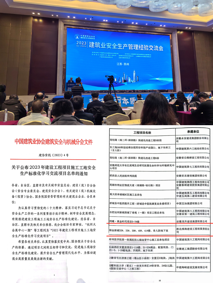 12月15日,由中國建筑業(yè)協(xié)會(huì)建筑安全與機(jī)械分會(huì)主辦的2023年建筑安全生產(chǎn)管理經(jīng)驗(yàn)交流會(huì)在蘇州召開,淮海建工公司綠金新城二期工程獲評(píng)全國建設(shè)工程項(xiàng)目施工安全標(biāo)準(zhǔn)化項(xiàng)目。這是該工程在獲評(píng)淮北市建筑安全生產(chǎn)標(biāo)準(zhǔn)化示范工地、安徽省建筑安全生產(chǎn)標(biāo)準(zhǔn)化示范工地等榮譽(yù)后獲得的又一殊榮,為目前國家建設(shè)部批準(zhǔn)的全國范圍內(nèi)建筑安全文明施工領(lǐng)域的高級(jí)別獎(jiǎng)項(xiàng)。
