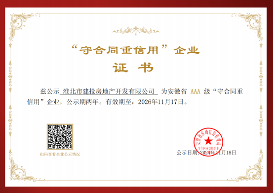 11月18日,省市場管理監督局發布了2022-2023年安徽省AAA級“守合同重信用”企業信用等級評定結果,淮北市建投房地產開發有限公司憑借良好的綜合實力和市場滿意度、信譽度,獲評“AAA”級守合同重信用企業稱號,成為全省618家“AAA”級信用企業之一。