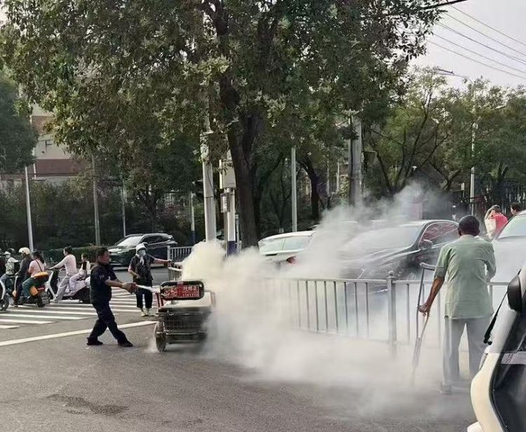 2025年6月11日上午7時41分許,淮北市保安有限公司武裝押運一中隊W699Y車組行駛至建設銀行西城支行網點路口時,突遇一輛三輪電動車自燃,火苗從車底迅猛竄出,騎車老人驚慌失措,周邊群眾紛紛后退。時值早高峰,車流人流密集,如不及時處置,后果不堪設想。