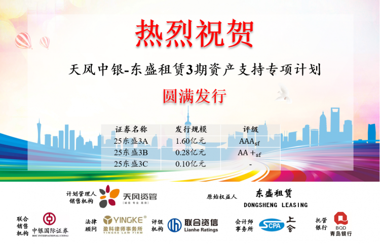 熱烈祝賀天風中銀-東盛租賃第3期資產支持專項計劃圓滿發行