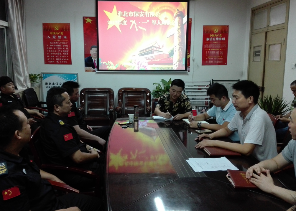 2017年7月27日下午19時,市保安公司"八一"建軍節座談會在二樓會議室舉行,金融武裝押運及人力防范退伍士兵隊員歡聚一堂,共慶光輝節日,共憶光榮傳統,共敘魚水深情。