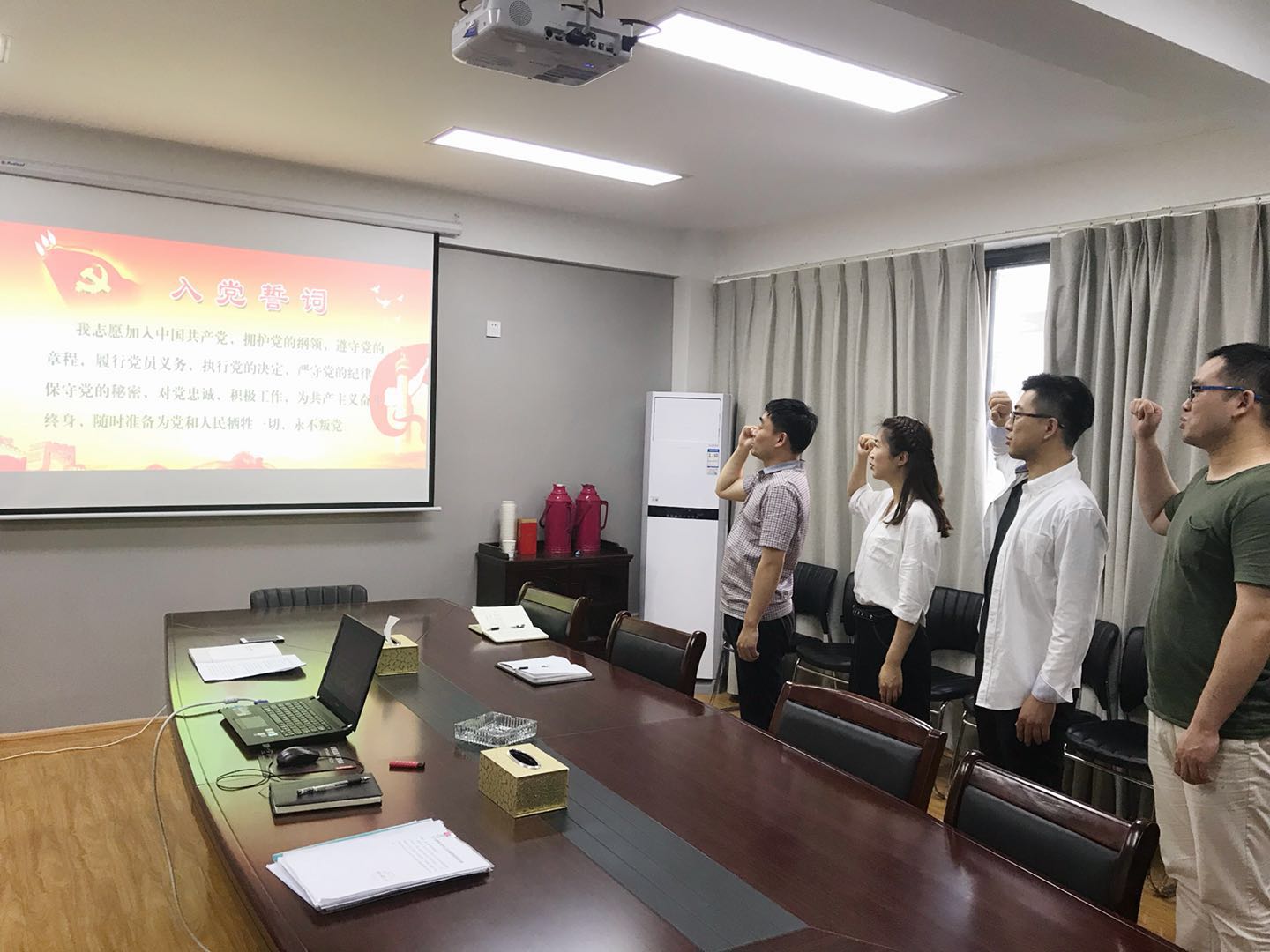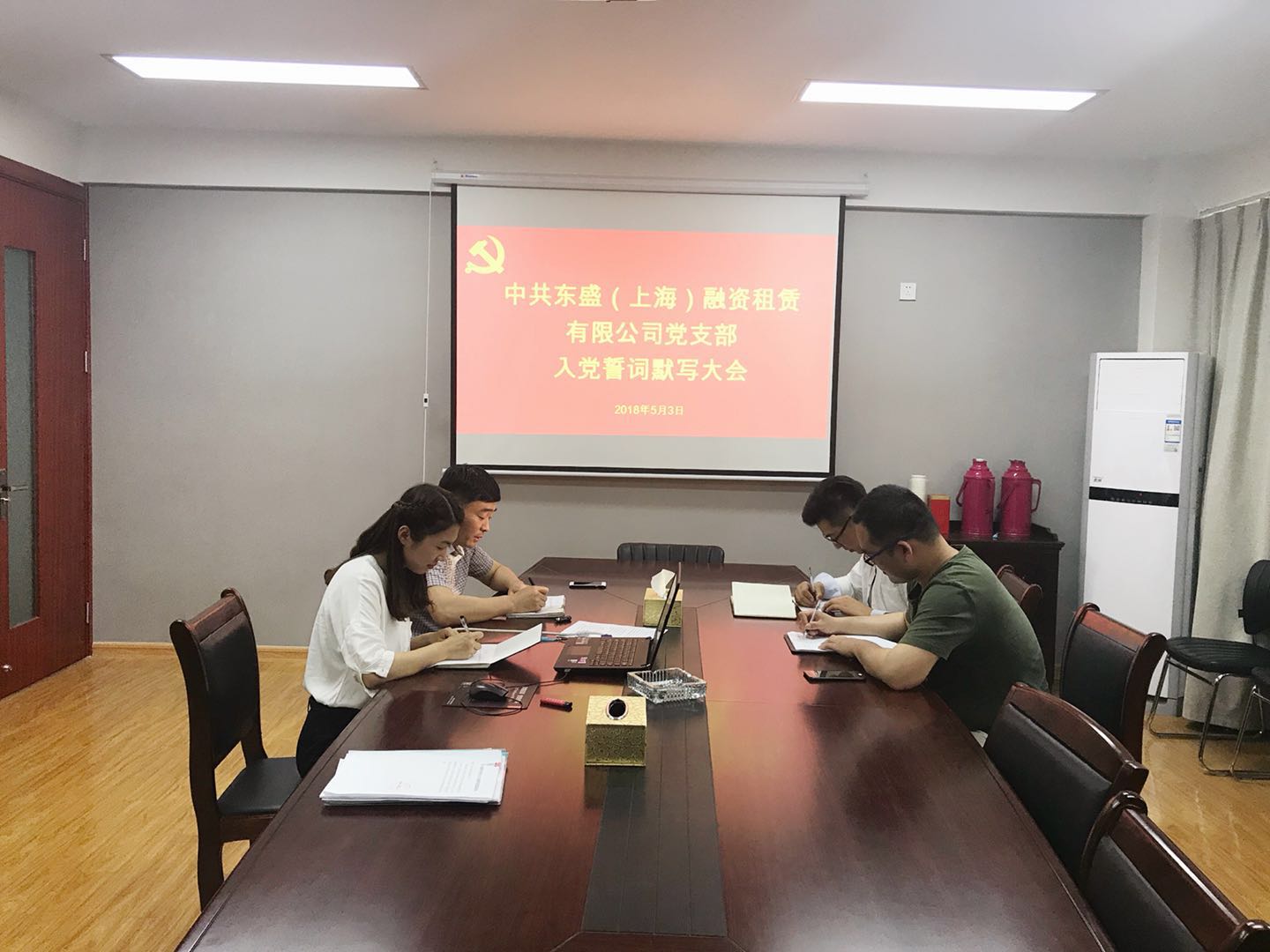 2018年5月3日下午,東盛公司全體黨員在會議室開展“重溫入黨誓詞”活動,在總經理王智的帶領下,面對黨旗,大家舉起右手,精神飽滿、莊嚴宣誓,集體重溫入黨誓詞。并在宣誓后,進行了入黨誓詞的默寫。