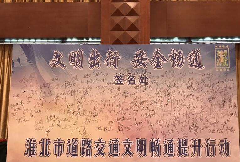 啟動儀式上,市政府副市長、公安局黨委書記、局長章銀發動員講話,動員全市各行各業積極參與到“文明出行 安全暢通”淮北市道路交通文明暢通提升行動計劃中去。與會的來自各行各業的代表共同觀看了文明交通公益廣告招貼畫作品,并紛紛在安全出行簽名欄上簽字。