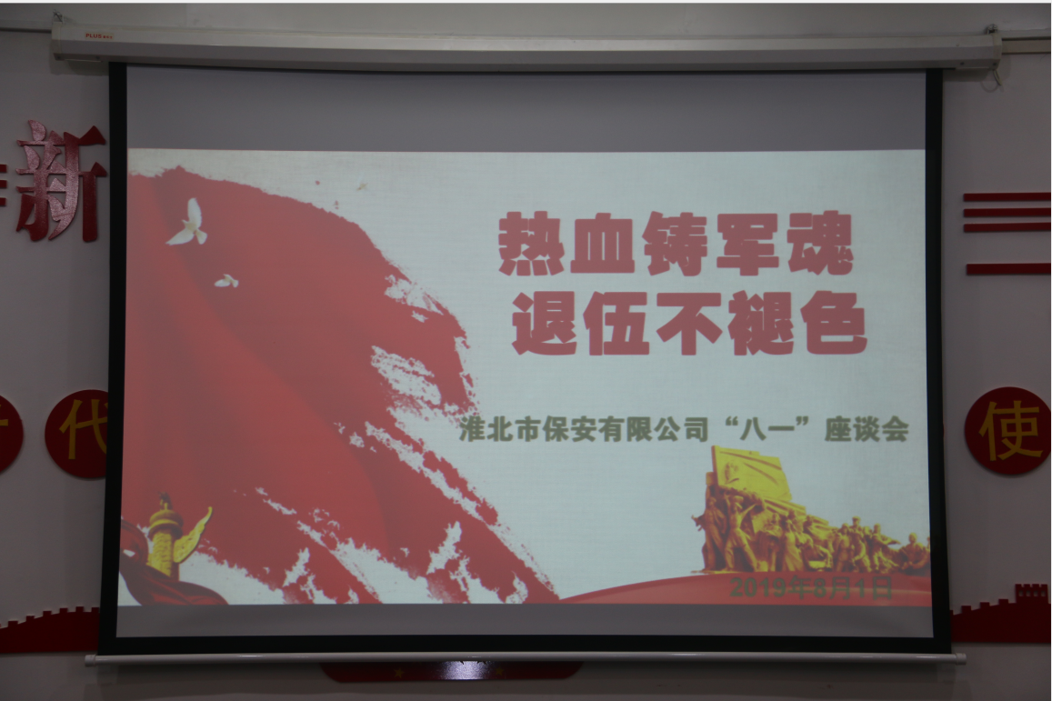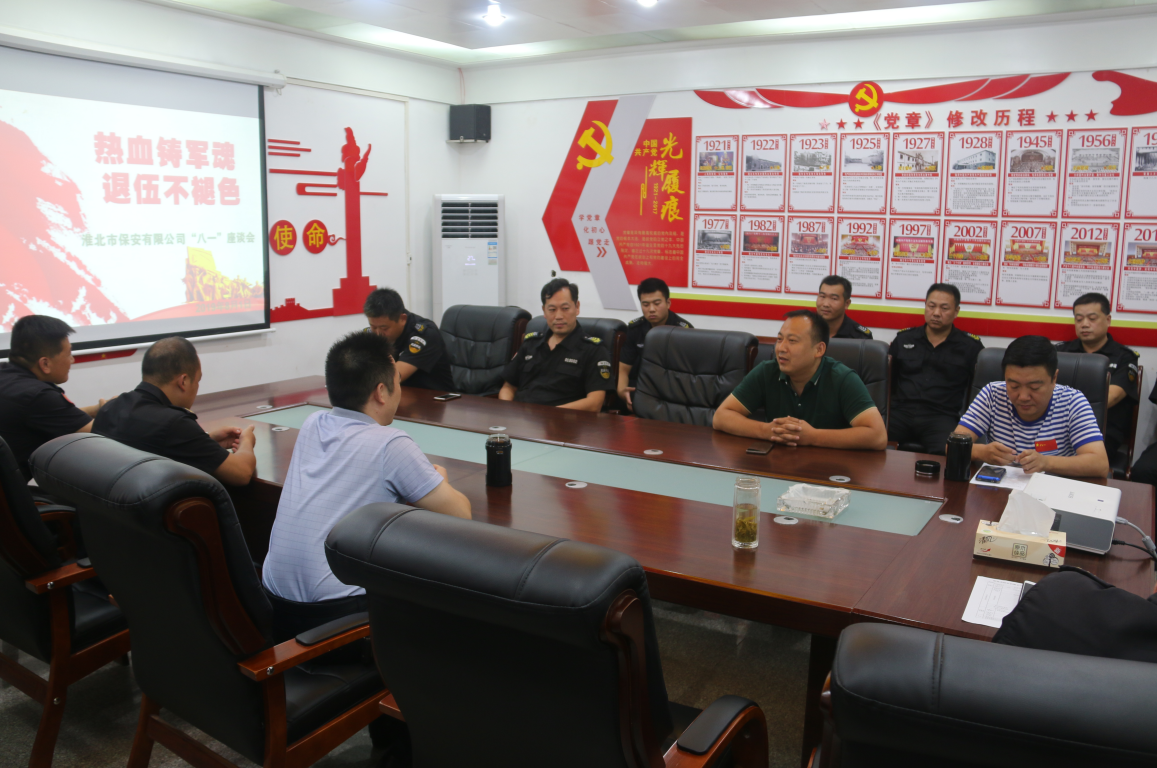 “八一”建軍節來臨,為慶祝中國人民解放軍建軍92周年,做好退役軍人慰問和組織關懷工作,淮北市保安有限公司于8月1日上午,召開以“熱血鑄軍魂·退伍不褪色 ”為主題的復員退伍軍人座談會。邀請公司退役軍人代表參加了座談。