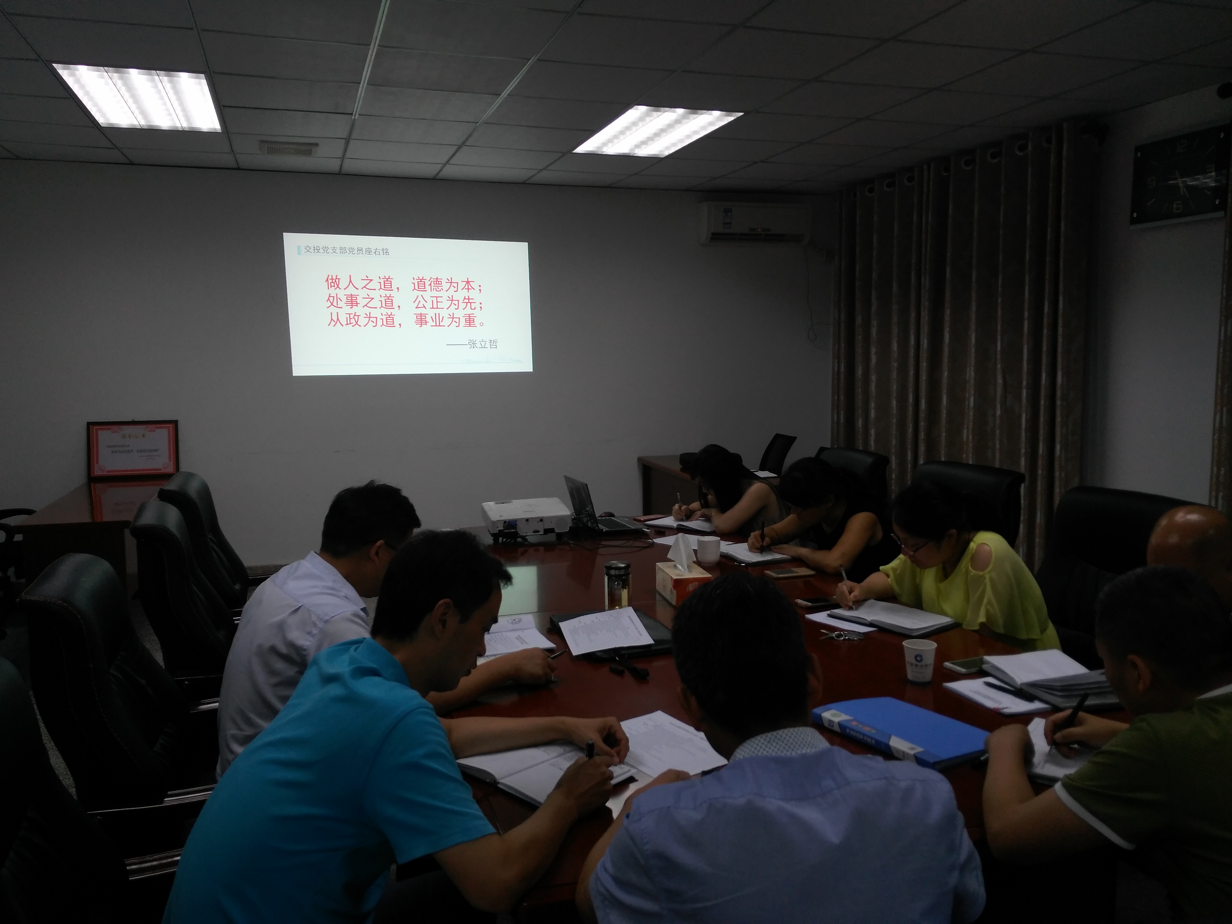黨員座右銘是黨員同志保持清正廉潔的名言警句,是每個共產黨員為社會主義事業不斷奮斗的不竭動力。市交投總經理張立哲要求全體黨員要時刻銘記自己的黨員身份,在工作中、生活中對自己要高標準嚴要求,嚴格執行集團公司關于黨風廉政建設的各項規定,通過“兩學一做”學習教育活動提升自身紀律意識,思想水平,做一名合格的共產黨員。